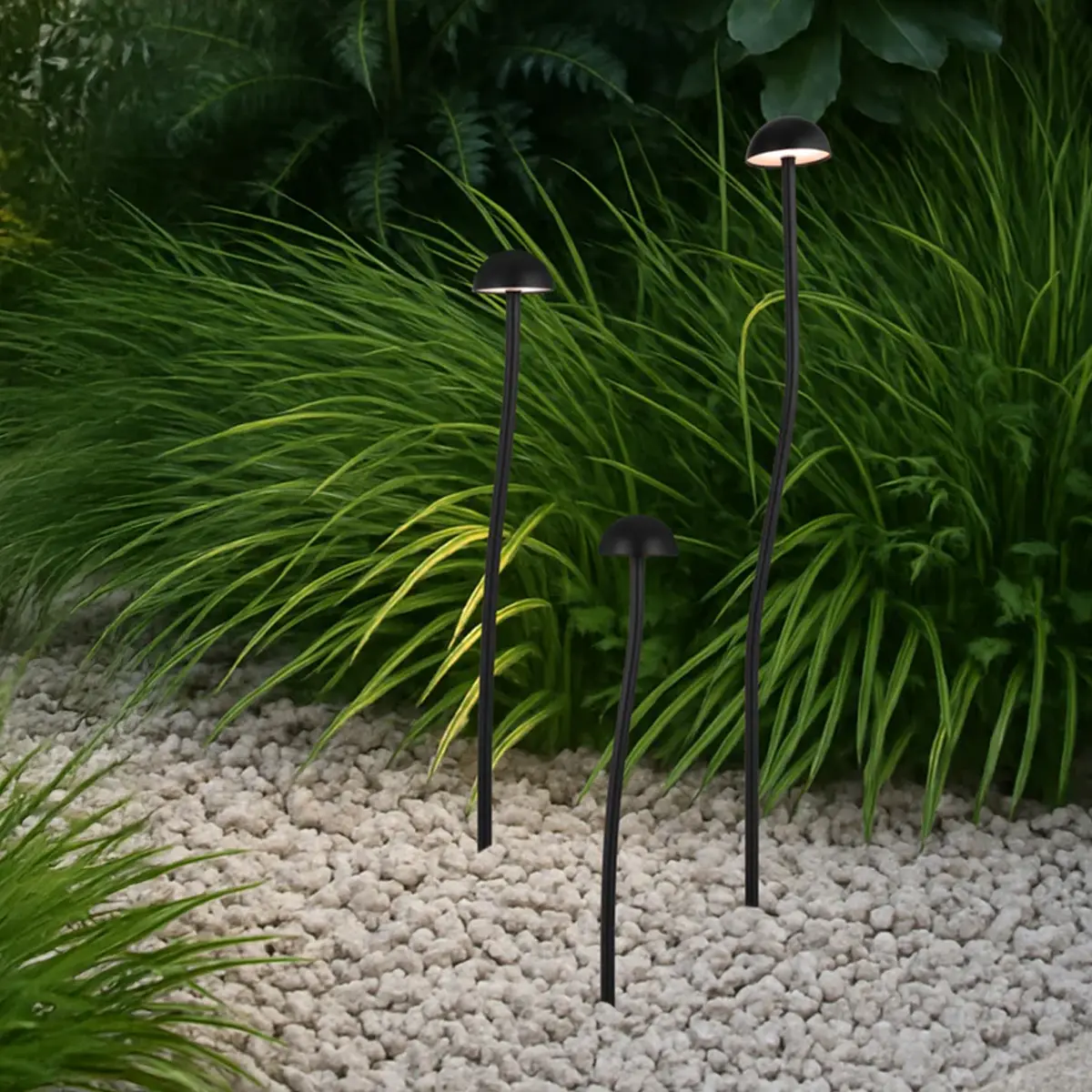The Enoki post light set brings a contemporary edge to garden lighting. With three gently curved posts in varying heights of 40cm, 50cm, and 70cm, Enoki creates movement and visual interest throughout outdoor spaces. Finished in black sand or white sand, and featuring an integrated LED with a warm 3000K glow and an IP65 rating, it’s a stylish yet durable alternative to traditional straight post lights.